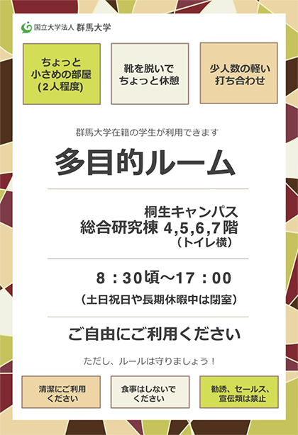 | 1 | 総合研究棟3階 | 平日8:30~18:00 |